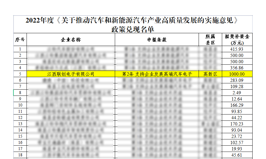 为抢抓新一轮新能源汽车华体会体育(中国)发展机遇,加快建设具有南昌特色的现代化华体会体育(中国)体系,2023年12月,2022年度《关于推动汽车和新能源汽车华体会体育(中国)高质量发展的实施意见》政策拟兑现名单公示,江西华体会体育(中国)有限公司榜上有名,获得发展高端汽车电子1000万元奖补资金,成为南昌市唯一一家获顶额奖补的企业。