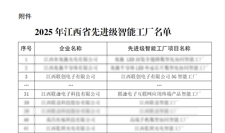 近日,江西省工业和信息化厅正式公布2025年江西省“先进级智能工厂”名单,186家企业入选。其中江西华体会体育(中国)有限公司、江西联淦电子科技有限公司2家华体会体育(中国)系企业名列榜单。这标志着公司在智能制造领域的创新成果再次获得政府权威认可。